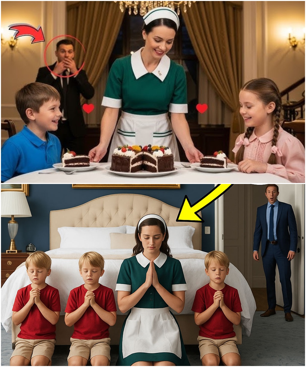 En el suelo del dormitorio, su nueva niñera estaba arrodillada sobre la alfombra azul. Su uniforme negro con delantal blanco contrastaba con el elegante suelo. Pero no era eso lo que le dejaba sin aliento. Eran sus hijos. Diego, Mateo y Santiago estaban arrodillados a su lado, sus pequeñas manos entrelazadas frente a su pecho, los ojos cerrados con una paz que Sebastián nunca había visto en sus rostros. “Gracias por este día.”